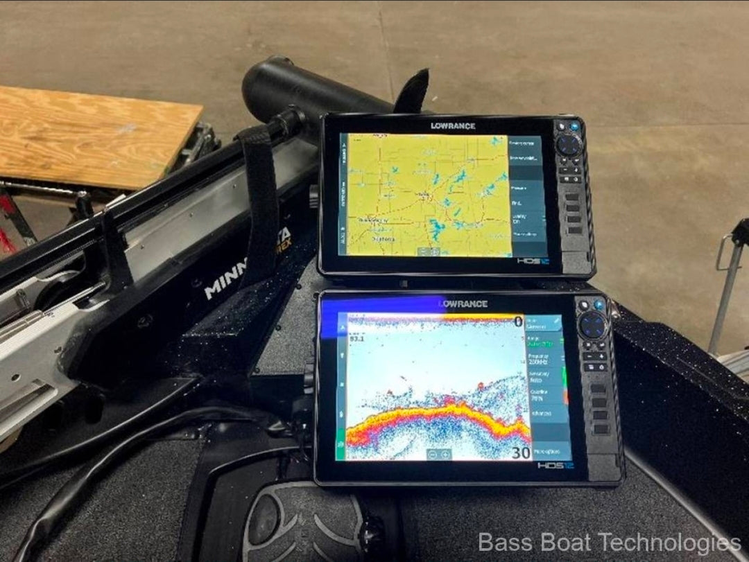 The 2024 Nitro ZV21 / 2025 ZV20 Dual Stack "Hood" Bow Mount facilitates the mounting of two fish finders securely. Its design ensures straightforward installation and provides convenient access to wiring without complete removal. Engineered for stability, it remains unaffected by rough water conditions.